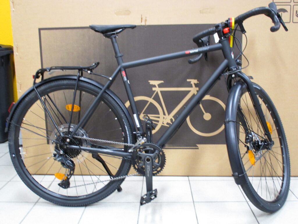 Vollausstatung mit Licht, Schutzbleche, Ständer und Gepäckträger.